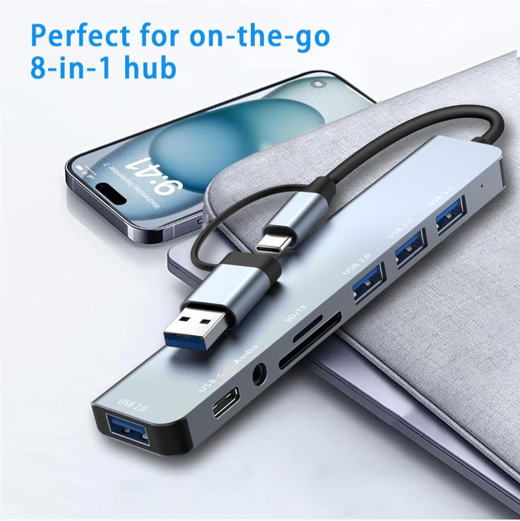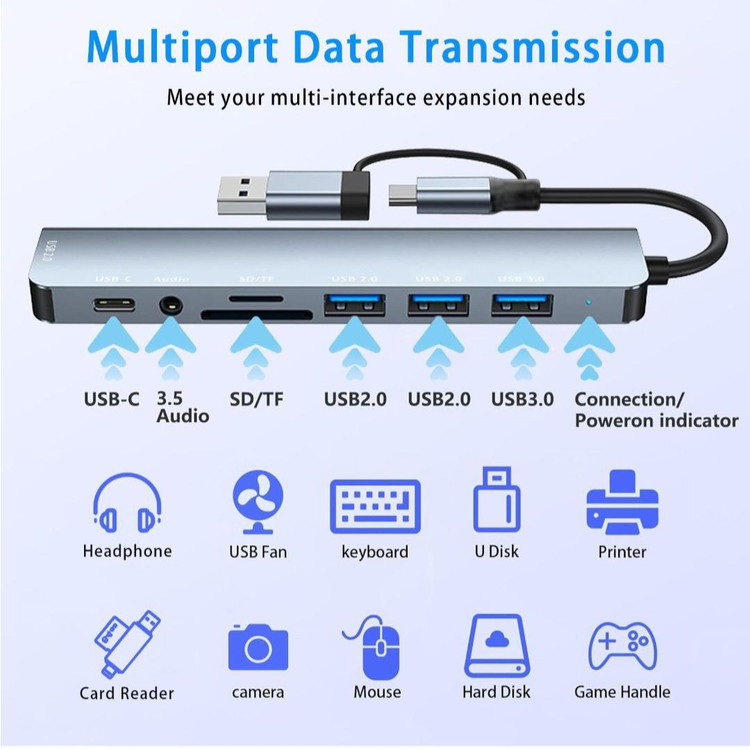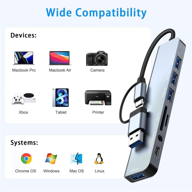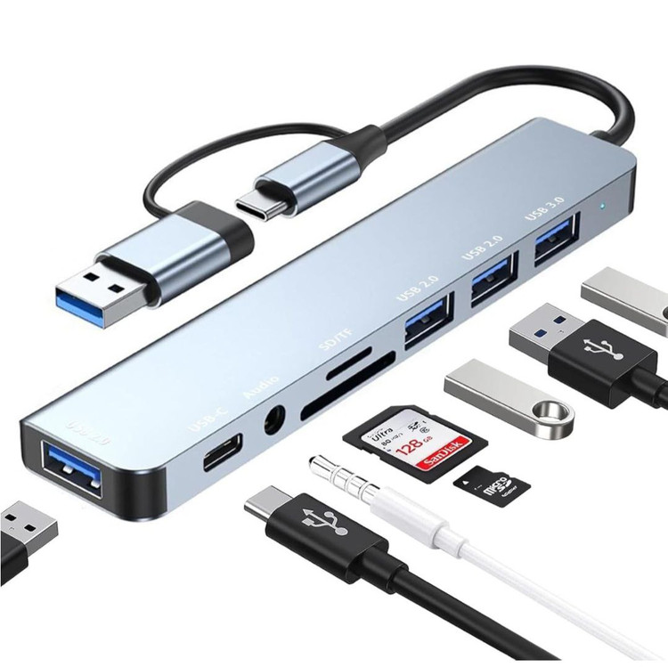 🟣آداپتور چند پورت با کارت خوان SD و TF، درگاه های USB 3.0، درگاه های USB 2.0، درگاه های صوتی 3.5 میلی متری،
