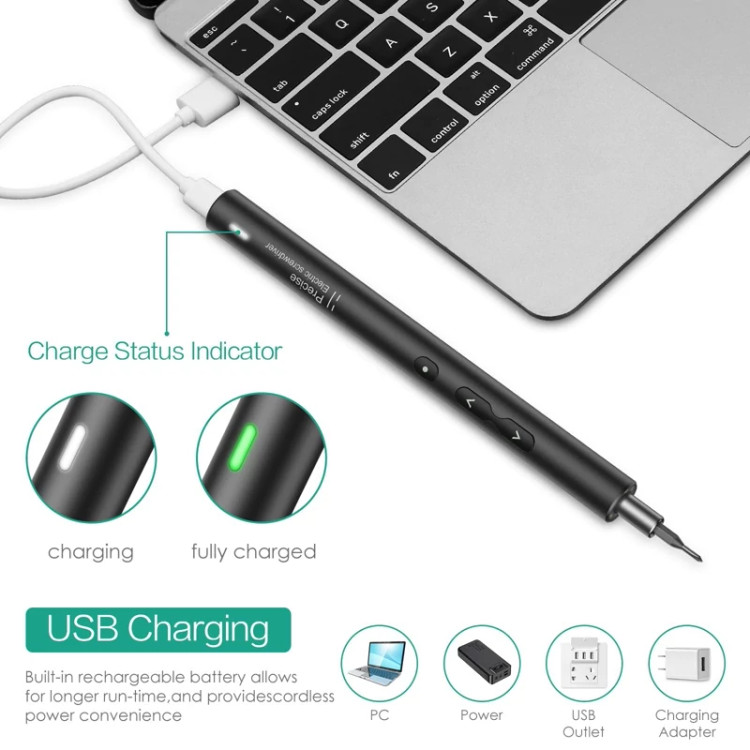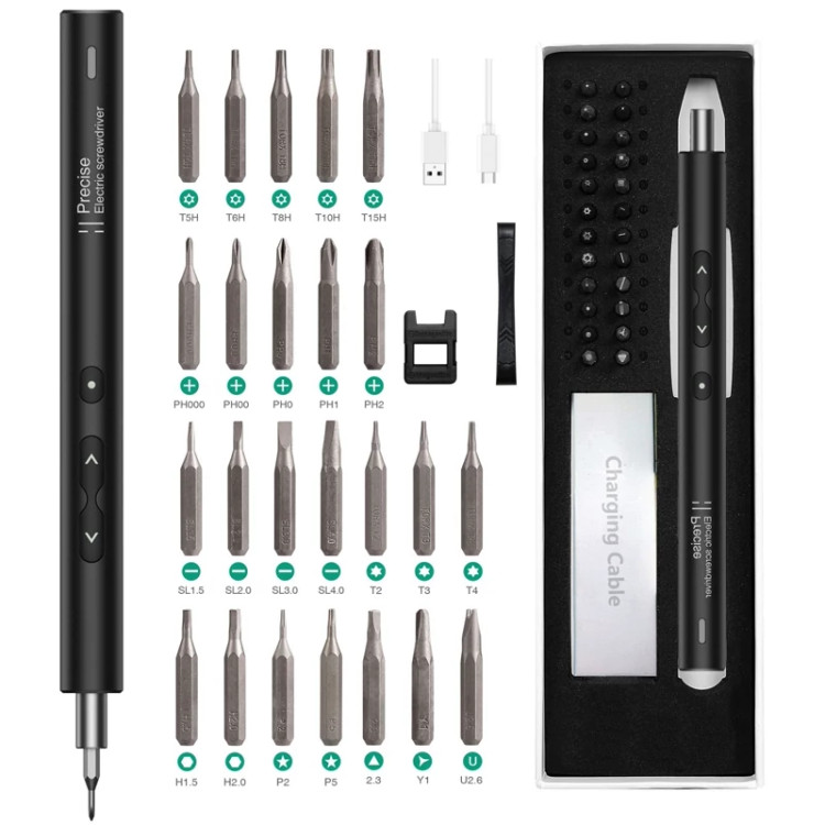 🔵این مجموعه پیچ گوشتی برقی شامل 24 بیت تخصصی دقیق، دسته پیچ گوشتی برقی، ابزار کنجکاوی پلاستیکی، خط شارژ USB، جعبه بسته بندی قابل حمل است که می تواند به شما کمک کند کارآمد و هوشمندانه کار کنید.