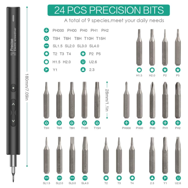 🔵پیچ گوشتی الکتریکی شامل 24 بیت معمولی مواد S2 به عنوان انواع زیر است: PH000, PH00, PH0, PH1, PH2. SL1.5، SL2.0، SL3.0، SL4.0؛ T2، T3، T4، T5H، T6H، T8H، T10H، T15H؛ H1.5، H2.0; P2، P5; U2.6; Y1; △2.3 که برای تلفن های هوشمند، دوربین ها، پهپادهای کنترل از راه دور، لپ تاپ ها، لوازم خانگی کوچک و ابزارهای دیگر طراحی شده اند.