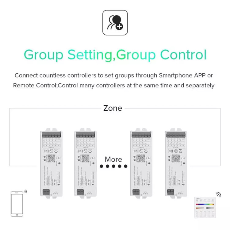 🔵فقط برای کاهش نور کنترل از راه دور. یک کنترلر می تواند سیگنال را از کنترل از راه دور به کنترل کننده دیگر در فاصله 30 متری منتقل کند. تا زمانی که یک کنترل کننده نوار LED در فاصله 30 متری وجود داشته باشد، فاصله کنترل از راه دور می تواند نامحدود باشد. همه کنترلرها باید از یک گروه باشند.