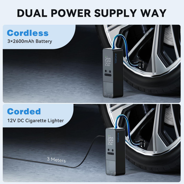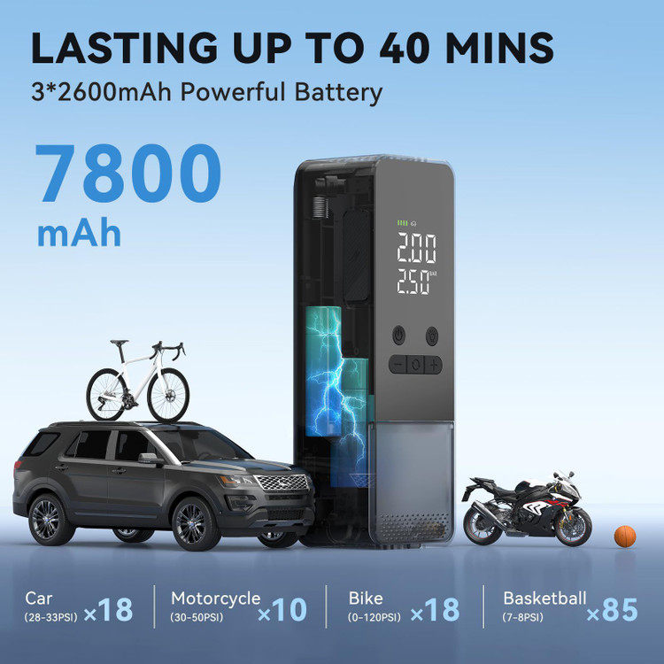 🔷️پمپ باد برقی ما که به ۳ باتری قابل شارژ ۲۶۰۰ میلیآمپر ساعتی مجهز شده است، میتواند تا ۴۰ دقیقه به طور مداوم و بیسیم باد لاستیک را باد کند. این پمپ باد لاستیک خودرو در صورت تمام شدن باتری به فندکی ۳ متری ۱۲ ولت DC مجهز است. علاوه بر این، شلنگ هوای ۴۰ سانتیمتری ضد سوختگی، باد کردن آسان لاستیک را از تمام زوایا برای ایمنی بیشتر امکانپذیر میکند.