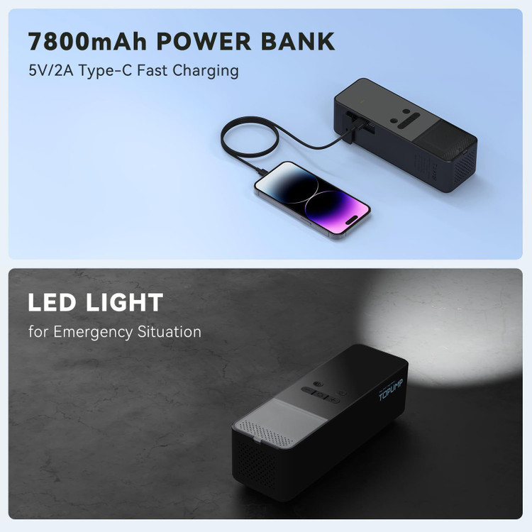 🔷️علاوه بر اینکه یک کمپرسور هوای ماشین است، میتواند به عنوان چراغ اضطراری و پاوربانک نیز استفاده شود. چراغ LED بالای پمپ هوا برای مواقع اضطراری در تاریکی و پورت ورودی USB-C و پورت خروجی USB-A آن میتواند به عنوان منبع تغذیه همراه استفاده شود. استفاده، حمل و نگهداری آسان، آن را برای یک سفر بدون نگرانی با خود ببرید!