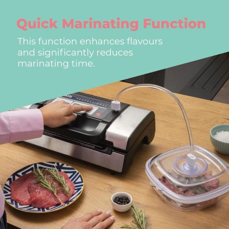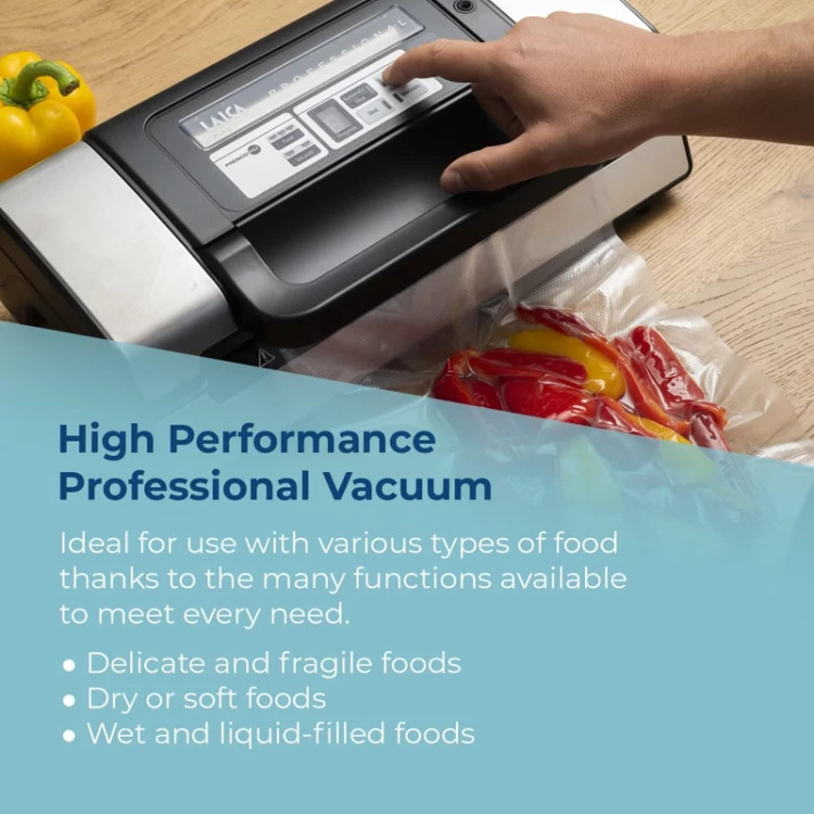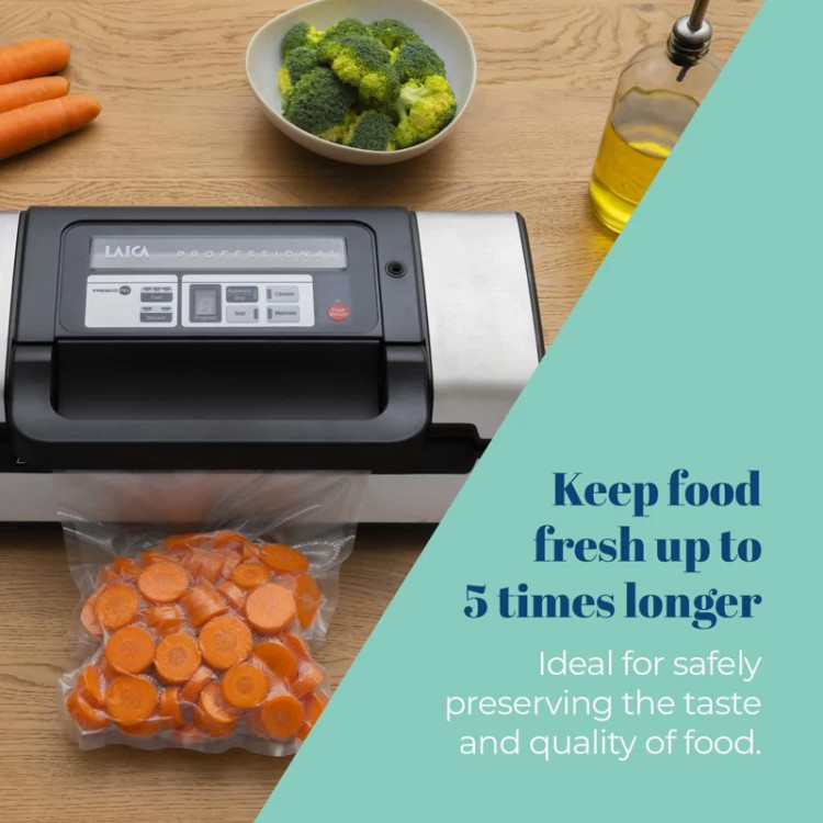 🔵این سیلر راحت وکیوم مواد غذایی همچنین دارای عملکرد "مرینیت سریع" است که طعم را بهبود می بخشد و زمان مارین کردن را کاهش می دهد. راحتی و کارایی دستگاه های جاروبرقی VT3240 و کیسه های اضافی را در آشپزخانه خود تجربه کنید. کیسه های LAICA به گونه ای طراحی شده اند که مواد غذایی را تا 5 برابر بیشتر تازه نگه می دارند و در عین حال از آسیب فریزر و از بین بردن هرگونه بو در یخچال جلوگیری می کنند.