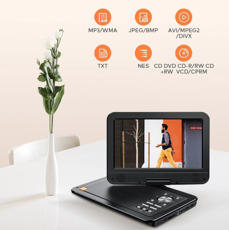 🔷️صفحه نمایش دیجیتال 10.5 اینچی، به همراه صفحه نمایش چرخان 270 درجهای آن، به راحتی به راست یا چپ چرخانده میشود. صفحه نمایش تبلت مانند با چرخاندن 180 درجه فعال میشود. نگران باتری هستید؟ حالا میتوانید تا 5 ساعت از دیویدیهای مورد علاقه خود لذت ببرید. آداپتور برق متناوب و شارژر فندکی موجود در بسته، پخشکننده دیویدی را در خانه یا ماشین شما شارژ میکند.