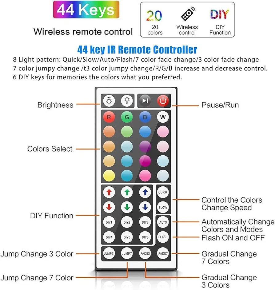 🔷️از بین 20 رنگ پر جنب و جوش، 6 رنگ DIY، 8 حالت تغییر رنگ پویا را انتخاب کنید و روشنایی را برای فضای عالی تنظیم کنید، همه اینها توسط ریموت کنترل می شود، بنابراین نیازی به بلند شدن از مبل یا تخت ندارید.