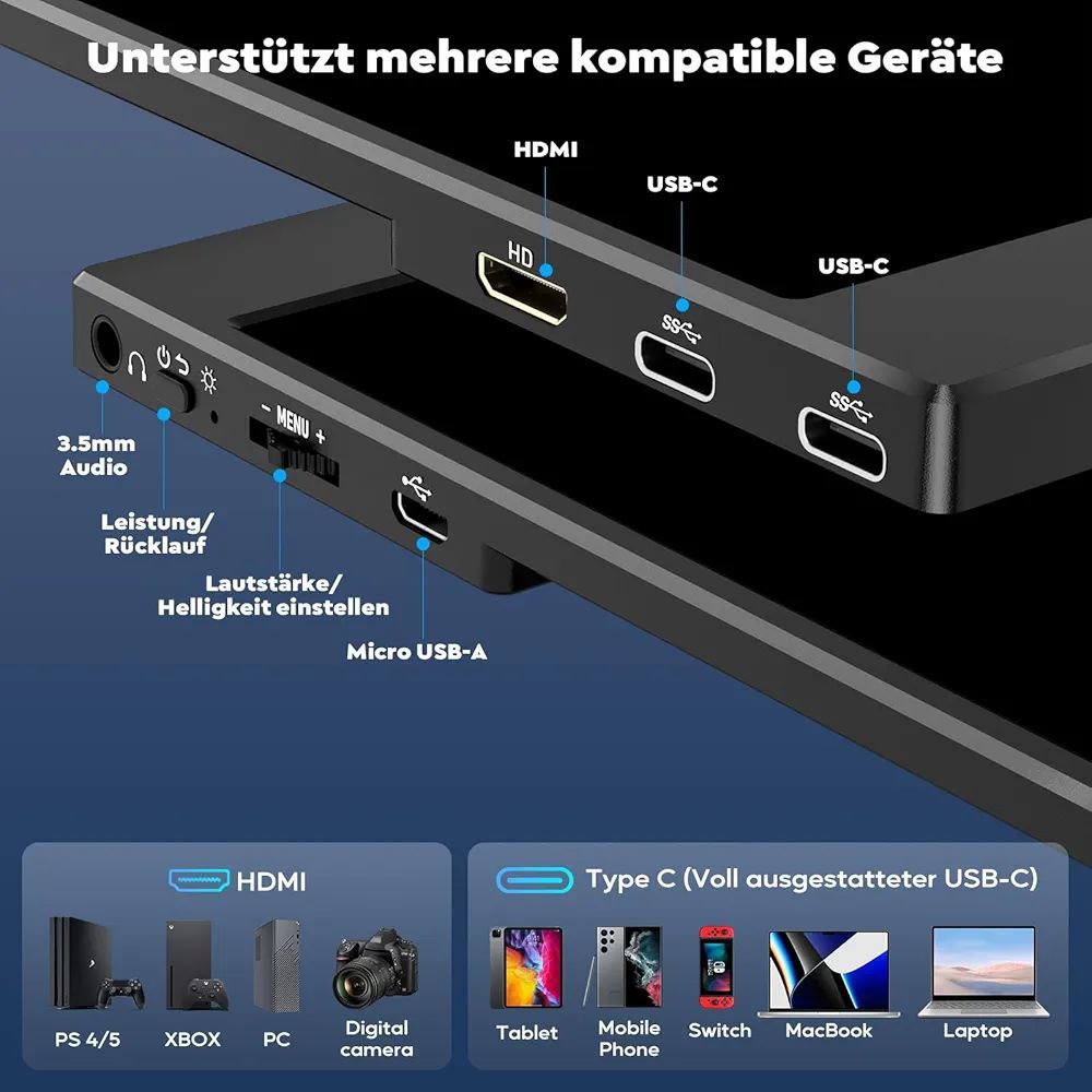 ✨️مانیتور قابل حمل برای لپ تاپ با USB-C به C، مینی HDMI به HDMI و کابل USB-to-C، با دو پورت USB-C و یک پورت HDMI، می توانید به راحتی مینی مانیتور را با لپ تاپ، PC، PS4/PS5، Xbox One یا سوئیچ و همچنین ماوس و صفحه کلید به پسوند لپ تاپ صفحه نمایش متصل کنید.