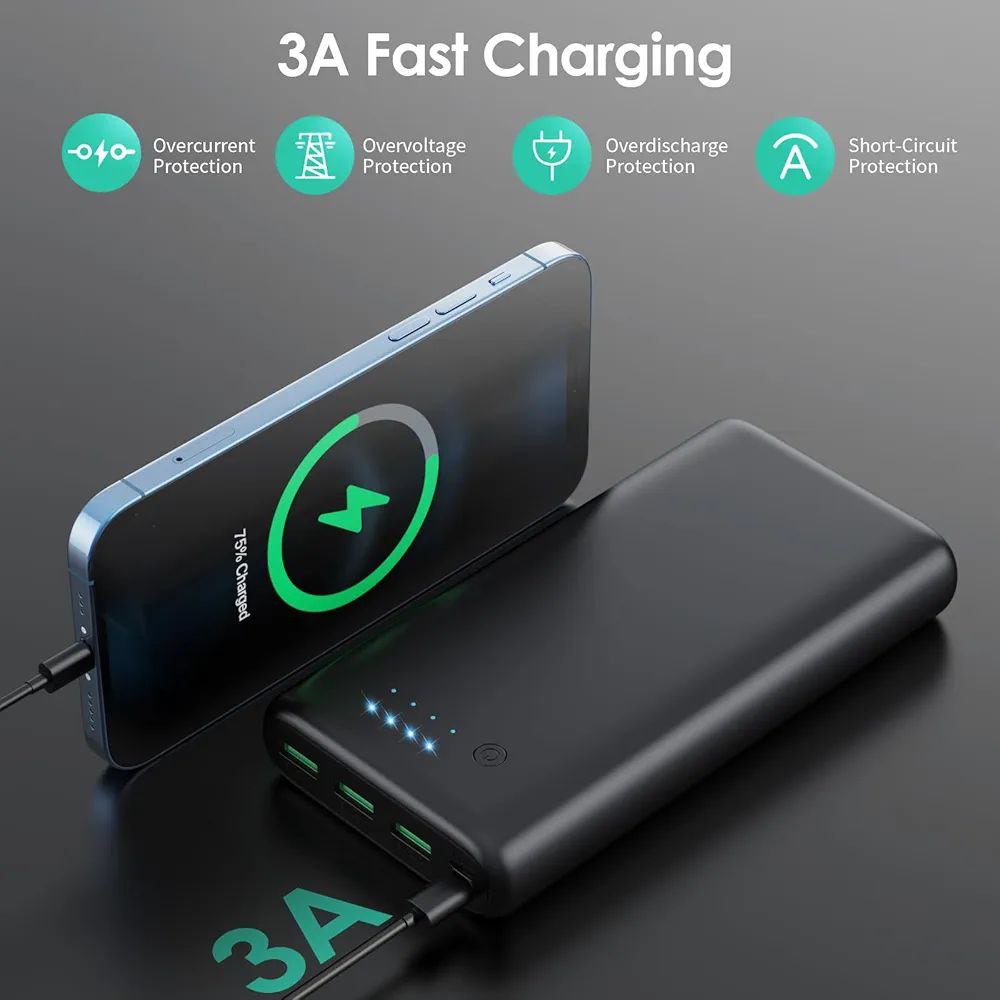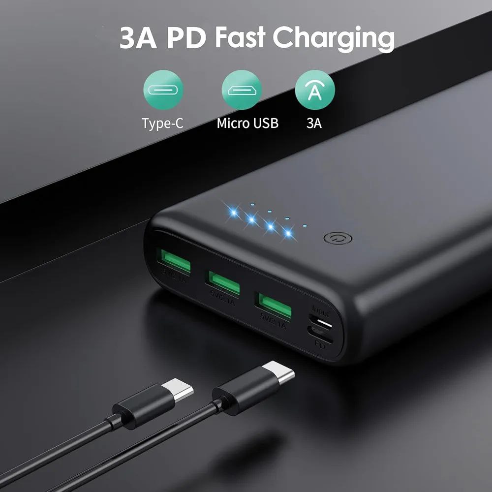 🔷️این پاوربانک دارای 4 خروجی، 1 عدد USB-C (5 ولت/3 آمپر)، 3 عدد میکرو USB (5 ولت/2.1 آمپر) و 2 ورودی (3 آمپر USB C + میکرو USB) است که امکان شارژ همزمان 4 دستگاه را فراهم می کند. اسکرول کنید