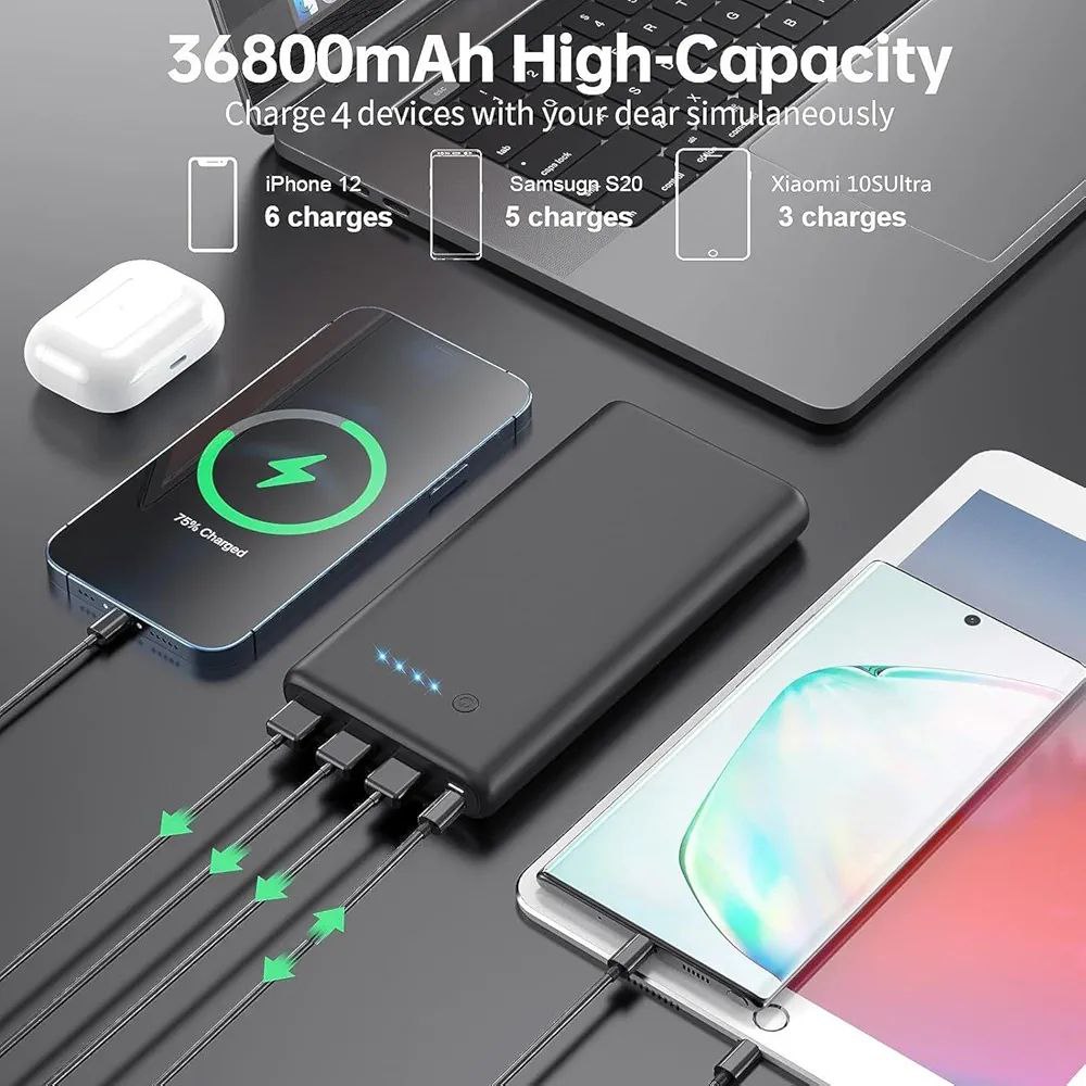 🔷️پاور بانک 36800 میلی آمپر با ظرفیت فوق العاده بالا می تواند برای آیفون 14/13/12 بیش از 6 بار، سامسونگ گلکسی S20 بیش از 5 بار شارژ شود. گوشی خود را در تمام طول روز روشن نگه دارید.